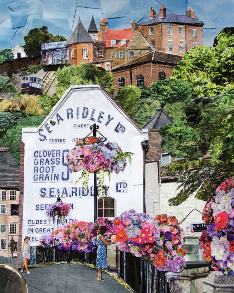 I create collage images of Shropshire market towns using paper from recycled magazines . The originals are photographed and turned into prints and cards.Prints are sold framed or unframed.