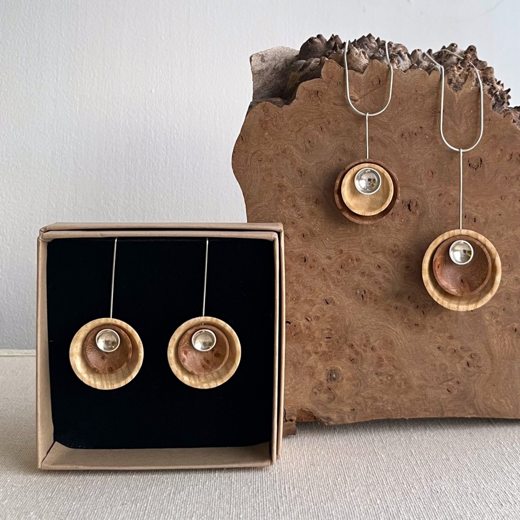 Flowers handcrafts affordable collections of minimal wooden jewellery, home décor and timeless statement pieces, that capture the essence of British woodlands. Sustainability is at the heart of all Danielle’s designs, inspired by mid-century modern design, clean lines and geometric forms, with the aim of showcasing raw materials through the traditional craft of woodturning. Each handcrafted element juxtaposes the unique grains of British hardwoods with the refined forms of 925 sterling silver, leather and brass, to create a harmonious balance between material qualities and their aesthetic values. Flowers sources native hardwoods directly from managed woodlands in Shropshire, milling, processing, and forming the timber in house.