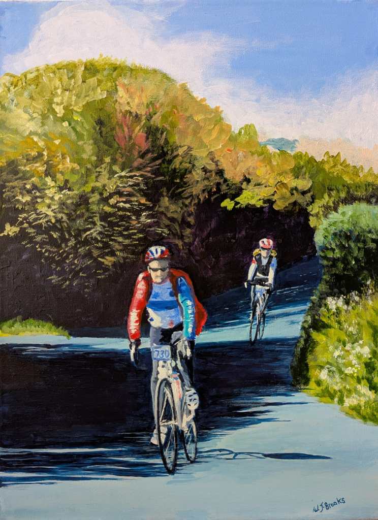 I paint mainly in acrylic, and enjoy painting a broad range of subjects, from trains at the Severn Valley Railway, Shropshire scenes like Daniels Mill, The Ironbridge and Blists Hill. Cyclists, Still life, Welsh scenes and native birds. I sell a few originals but mainly prints and framed prints. There are cards of all the above, plus new for this year, comic cartoons, seasonal and special occasion