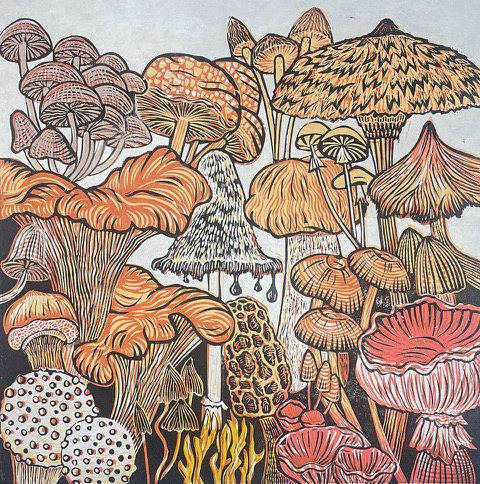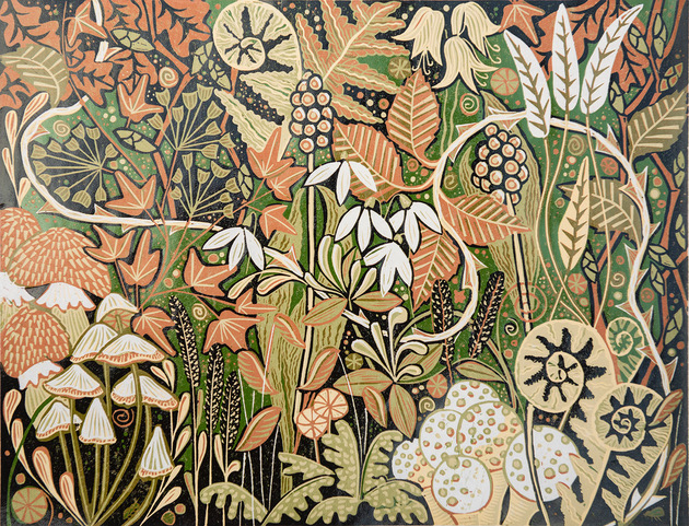 Mike’s printmaking ideas stem from many years as a graphic desiner and illustrator. His themes are based in nature and landscape with strong influenses fro the Arts& Crafts movement. Bold shapes and colours mix with a combination of realistic forms and stylised interpretations.